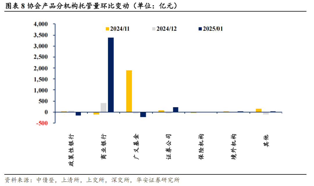 (2)协会产品:1月协会产品总托管量为15.6万亿元,较去年12月增加3249.0亿元。分机构来看,保险机构、广义基金持有量持续减少,商业银行持有量持续上升,证券公司、境外机构托管规模增量由负转正上升。