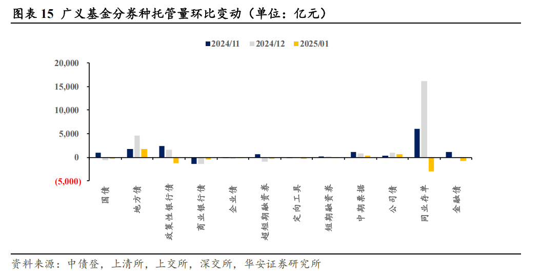 1月,广义基金托管量共减少5383.6亿元,政策性银行债、同业存单持有量减少。